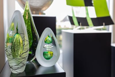 Door hun tijdloze vorm en subtiele details zijn glazen druppels geliefd als decoratief object, zowel los geplaatst als op een verlicht plateau.