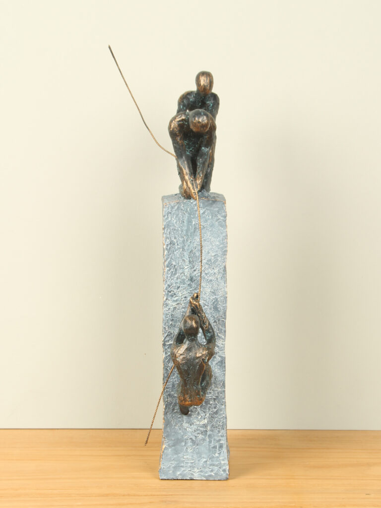 Het brons look beeldje Op elkaar vertrouwen is een sprekend beeldje waarin samenwerking en verbondenheid centraal staan. Drie figuren ondersteunen elkaar bij het beklimmen van een hoge zuil – een krachtige metafoor voor vertrouwen, doorzettingsvermogen en elkaar vooruithelpen. De compositie zit vol beweging en spanning, terwijl het geheel toch een mooie balans bewaart.