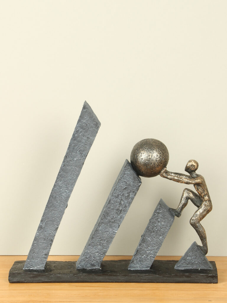 Het brons look beeldje Volharding is een expressief beeldje dat staat voor kracht, vastberadenheid en het blijven doorgaan, ook wanneer de weg omhoog moeilijk lijkt. De figuur duwt een zware bol voort langs oplopende vlakken – een krachtige metafoor voor persoonlijke groei, ambitie en het overwinnen van obstakels.