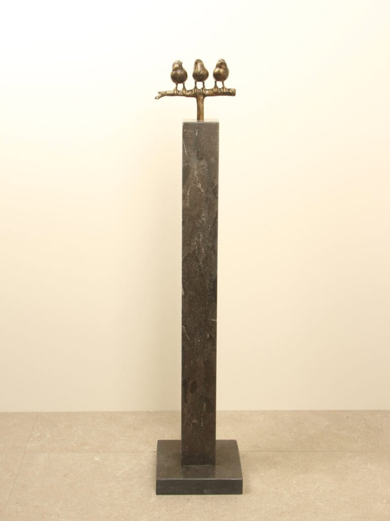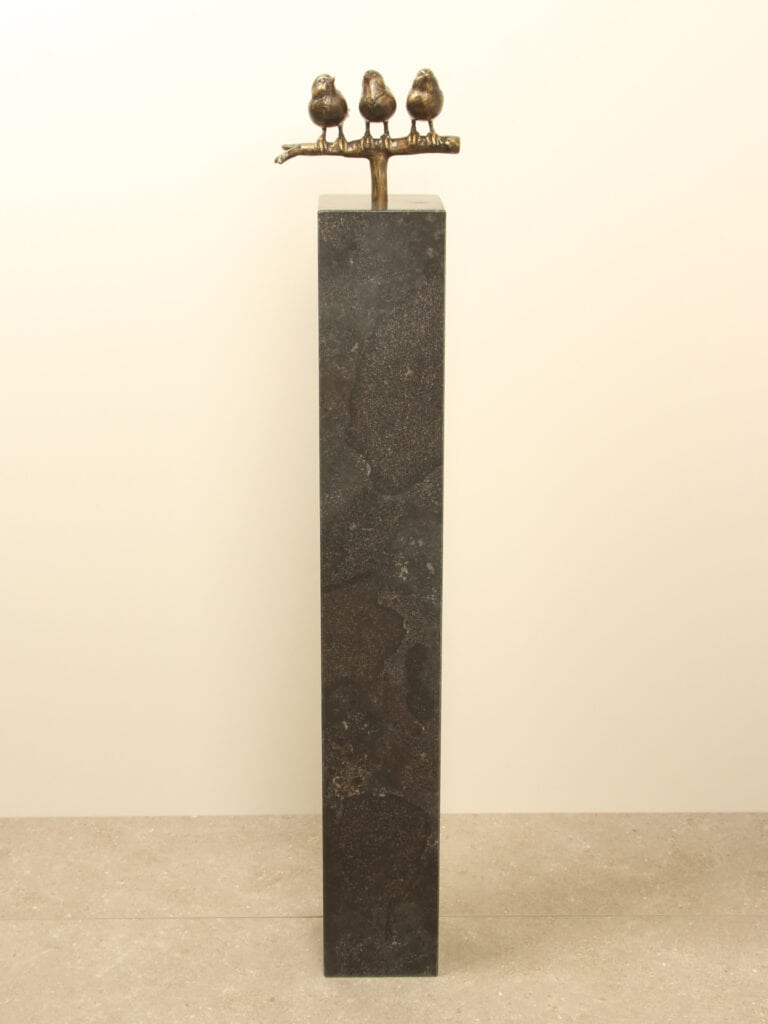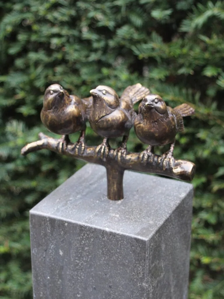 Het bronzen beeld 3 Mussen op tak straalt verbondenheid en levensvreugde uit. De drie mussen zitten dicht bij elkaar, alsof ze elkaars gezelschap koesteren en samen genieten van het moment. Het beeld staat op een buisje van Ø16 mm en kan prachtig gecombineerd worden met een sokkel met een passend voorgeboord gat.