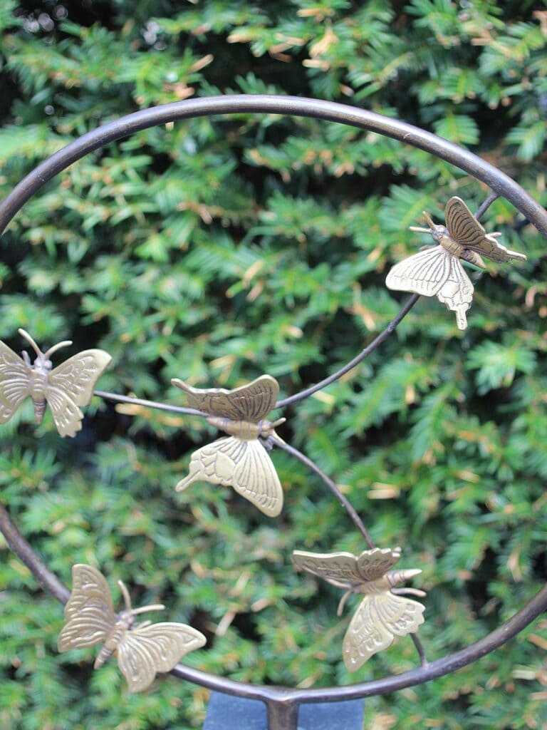 Het bronzen beeld 5 Messing vlinders is een verfijnde en poëtische blikvanger die direct de aandacht trekt. In een elegante cirkelvorm fladderen vijf messingkleurige vlinders speels om elkaar heen. Elk vlindertje is zorgvuldig vormgegeven, met fijne details die het gevoel van beweging en lichtheid versterken. Het beeld straalt vrijheid, verandering en het omarmen van nieuwe fases in het leven uit – symboliek die het een betekenisvol geschenk maakt voor talloze gelegenheden.
