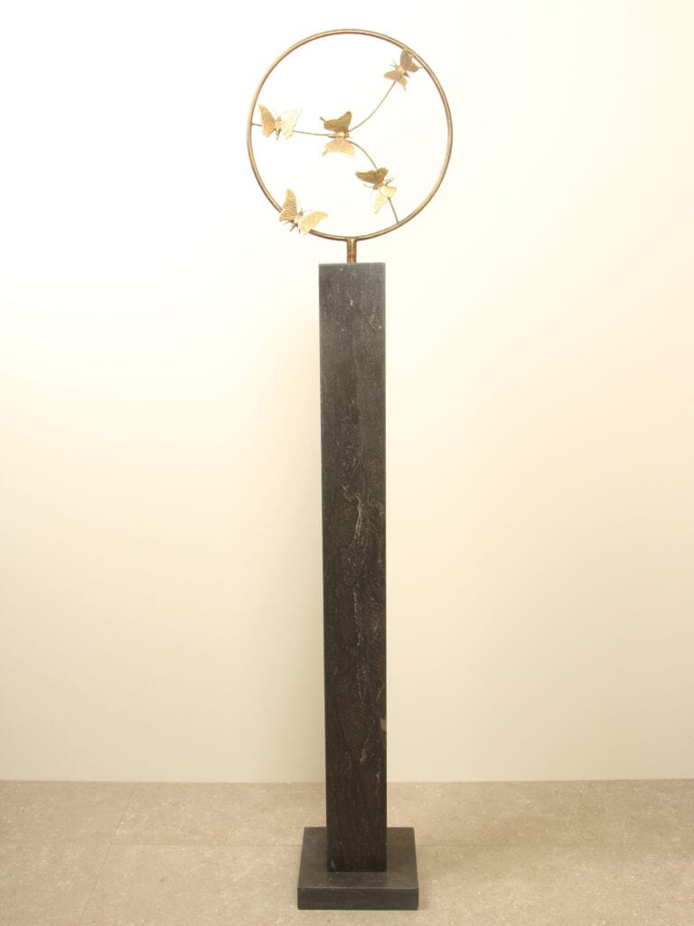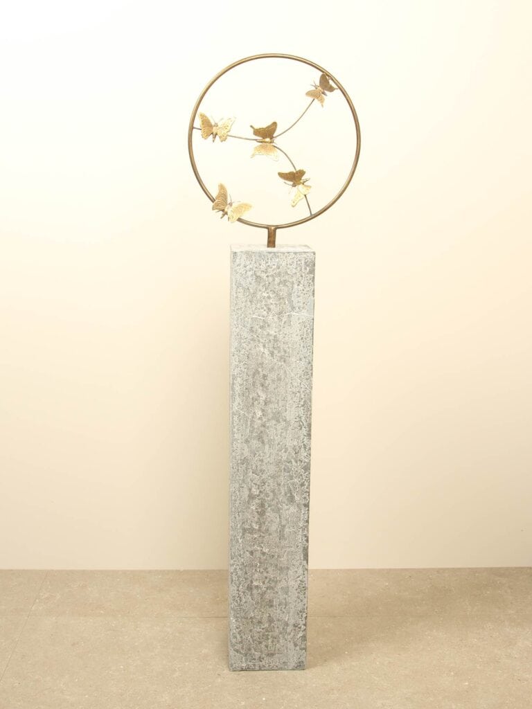 Dit sierlijke bronzen beeld toont vijf messing vlinders die in een speelse cirkelvorm dansen. Het staat op een stevig buisje van Ø16 mm, waardoor het perfect te combineren is met een sokkel met bijpassend voorgeboord gat. Een symbool van lichtheid, vrijheid en het koesteren van mooie momenten – prachtig voor zowel binnen als buiten.