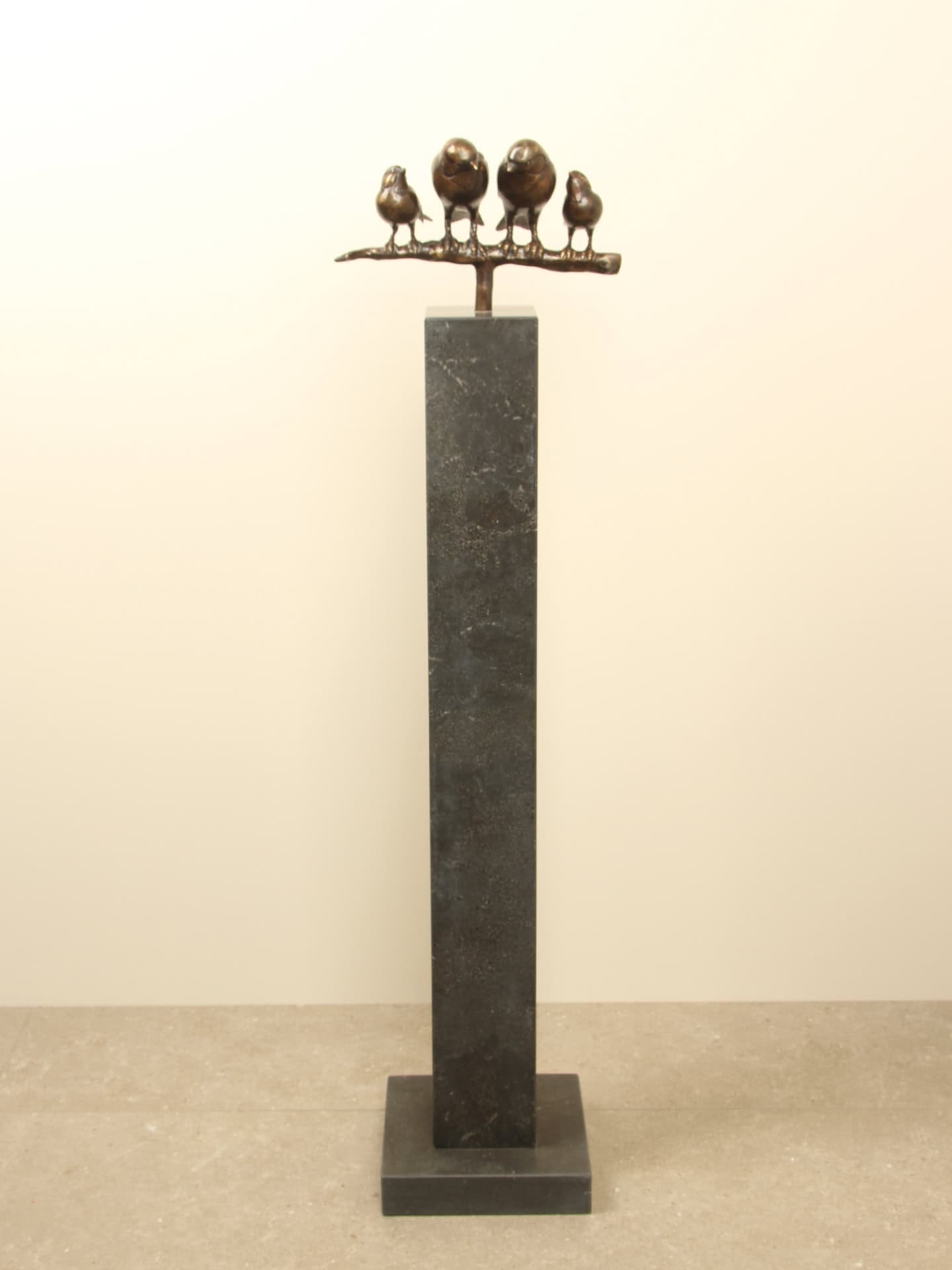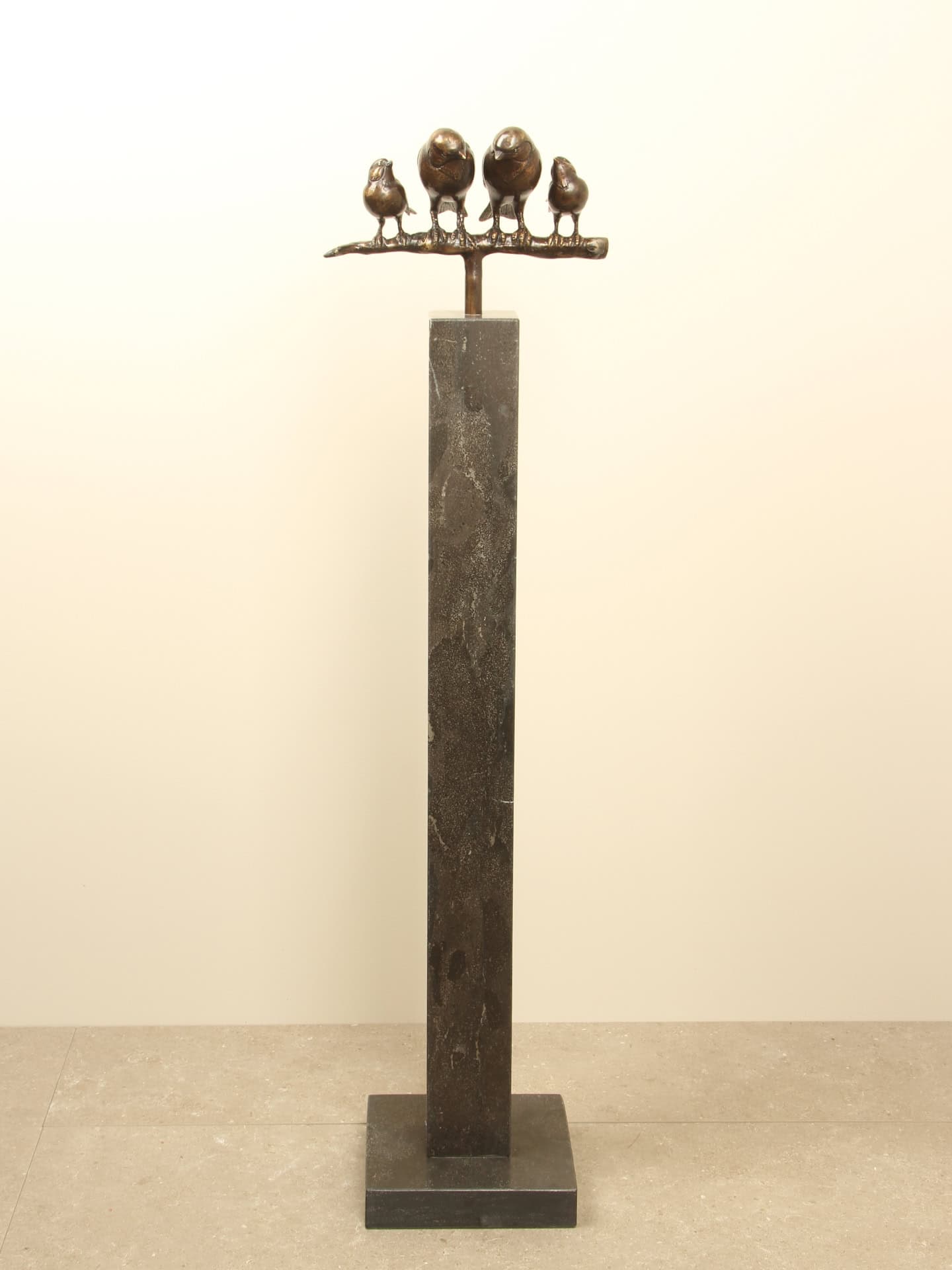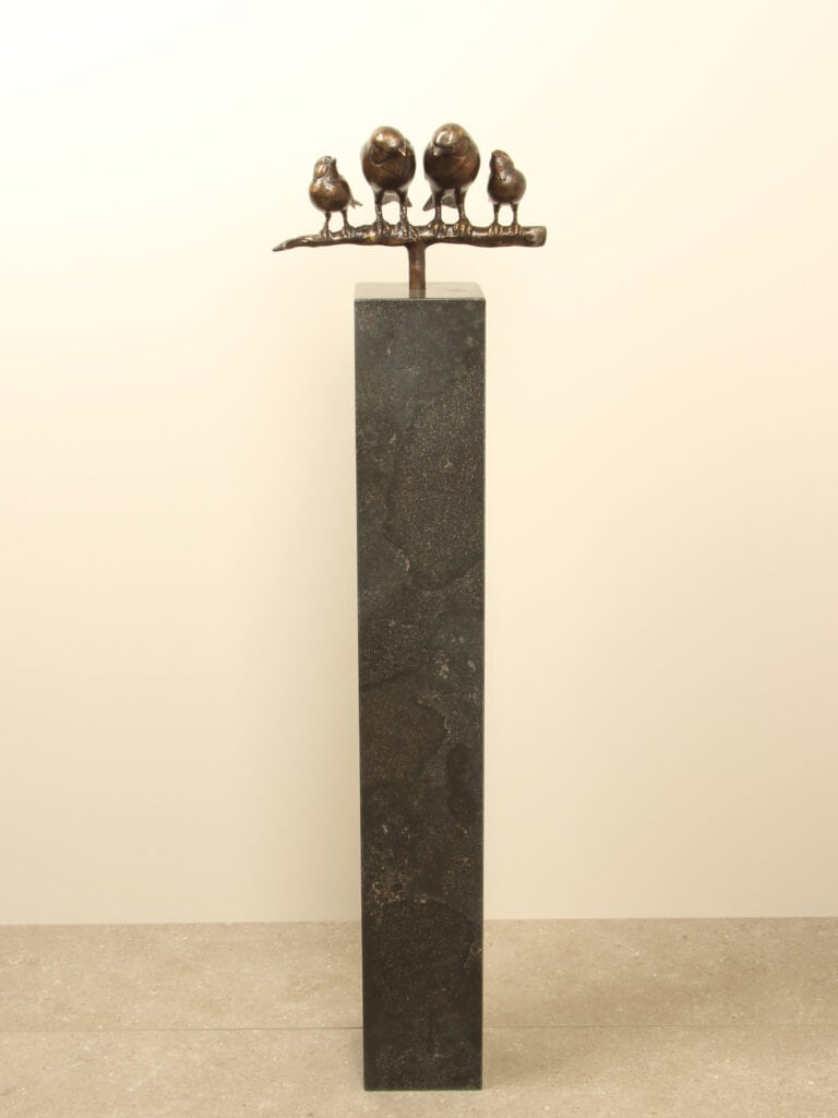 Het bronzen beeld Gezin mussen op tak toont een hartverwarmende scène van vier mussen die dicht bij elkaar zitten. Een symbool van verbondenheid, zorg en samenhorigheid. Het beeld staat op een stevig buisje van Ø16 mm, waardoor het prachtig te combineren is met een van onze sokkels met passend voorgeboord gat. Geschikt voor binnen én buiten.