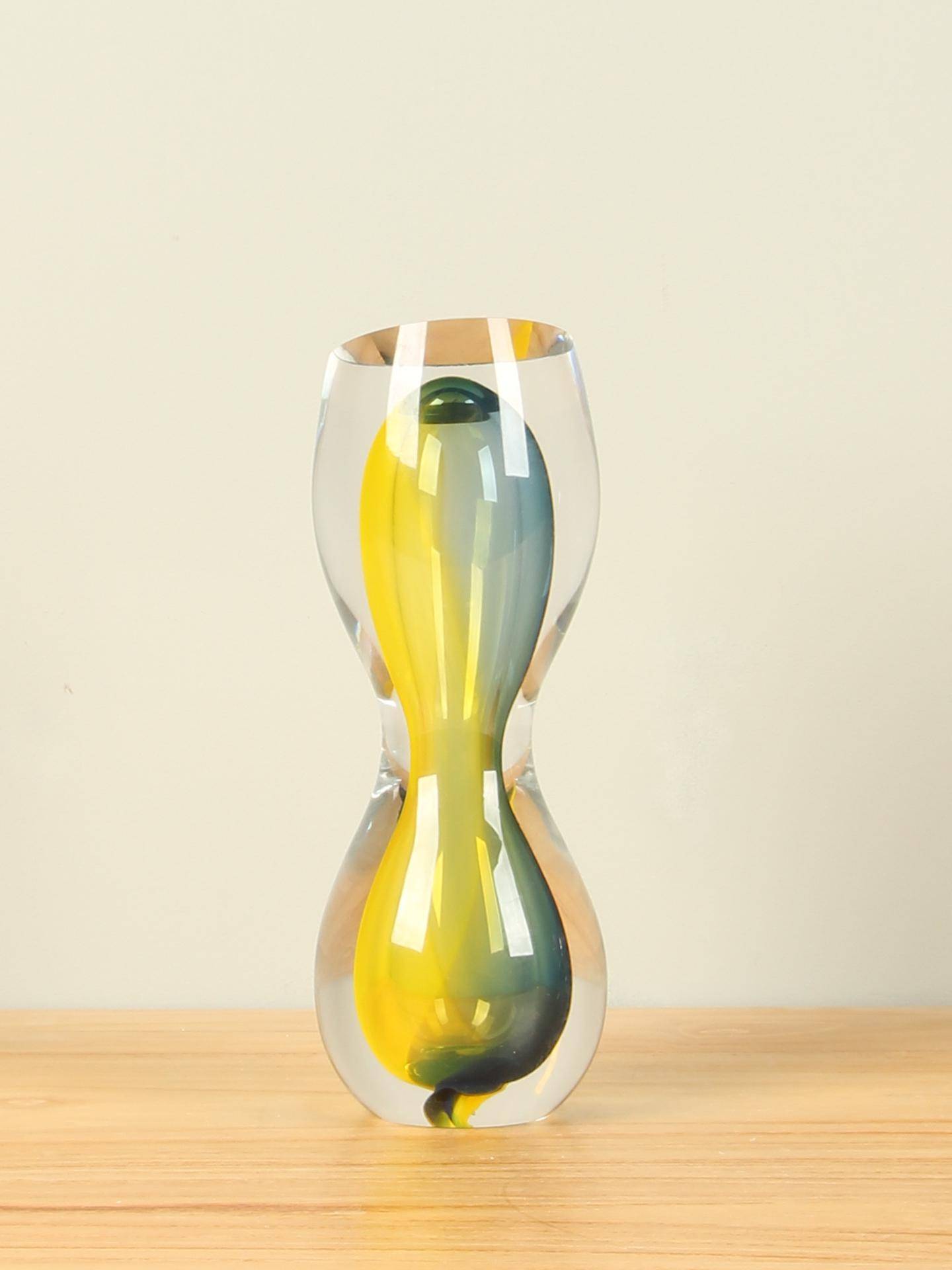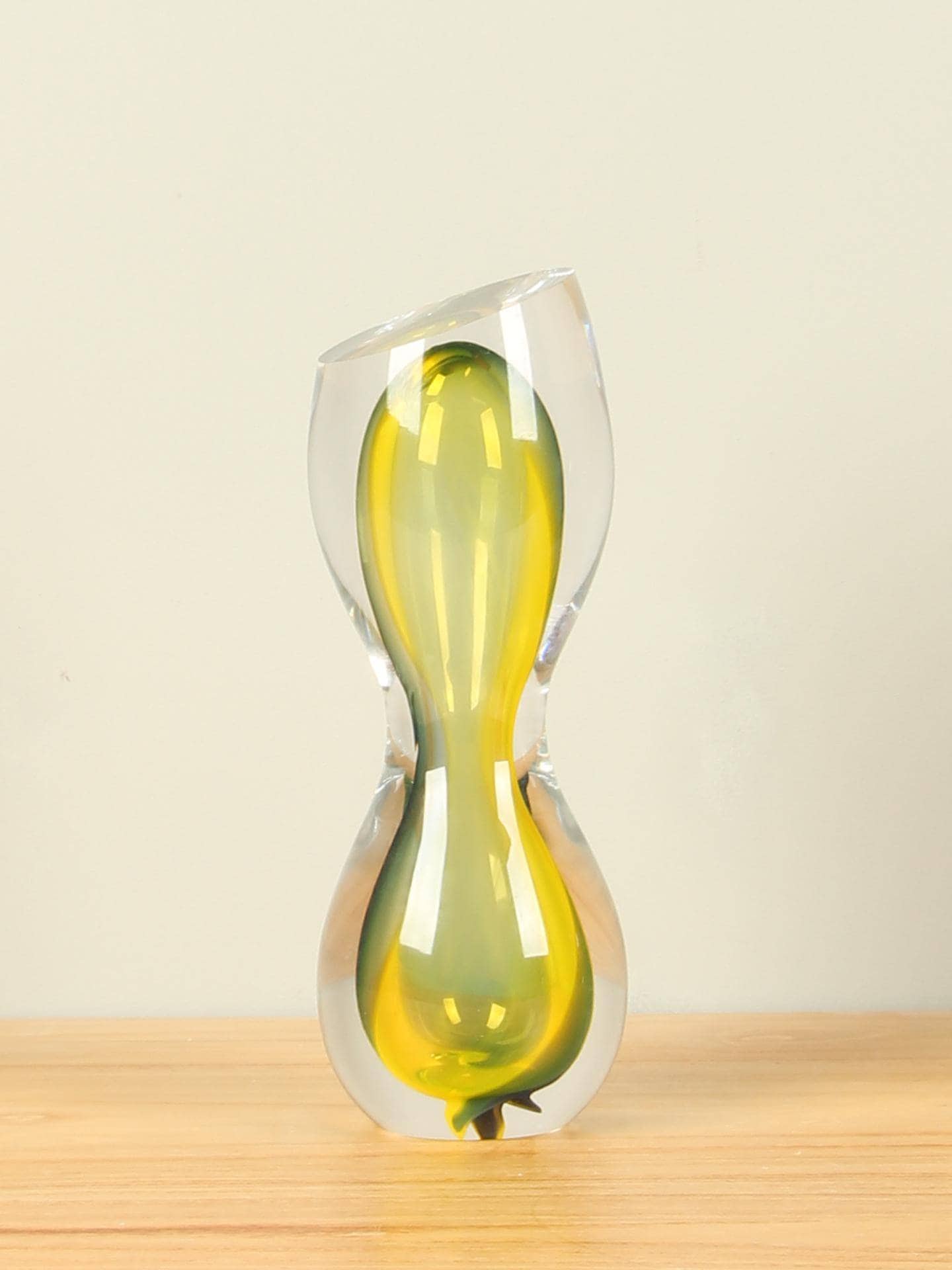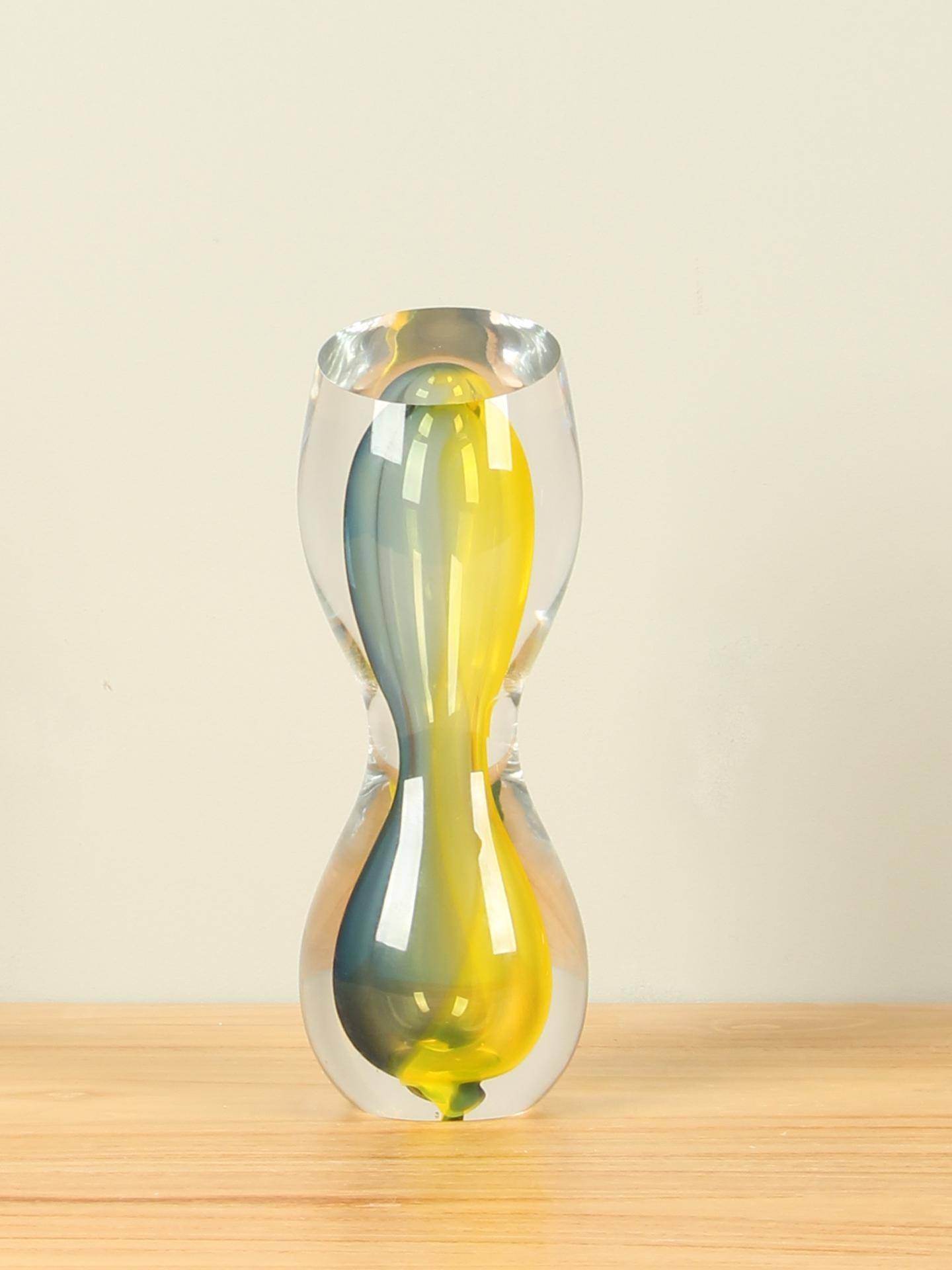 Glassculptuur – Geel – Glas – Figuur blauw/geel zandlopervorm, 23 cm