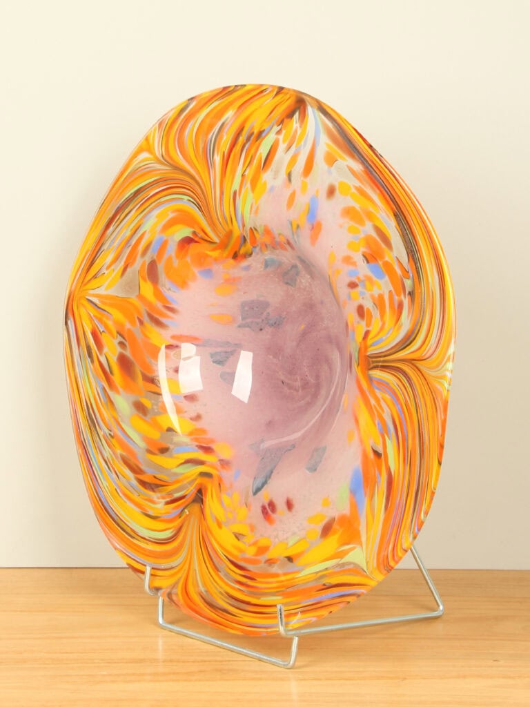 Deze handgemaakte glazen schaal is een kunstwerk op zichzelf. Kleuren en lijnen vloeien als vanzelf door het glas, waardoor geen enkele schaal precies hetzelfde is. Omdat elk stuk met de hand wordt gevormd, kan uw schaal subtiel afwijken van de foto — een teken van echt vakmanschap. Een schitterend object voor op tafel, dressoir of sokkel.