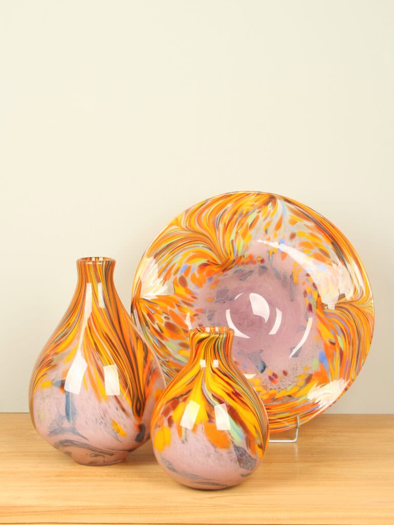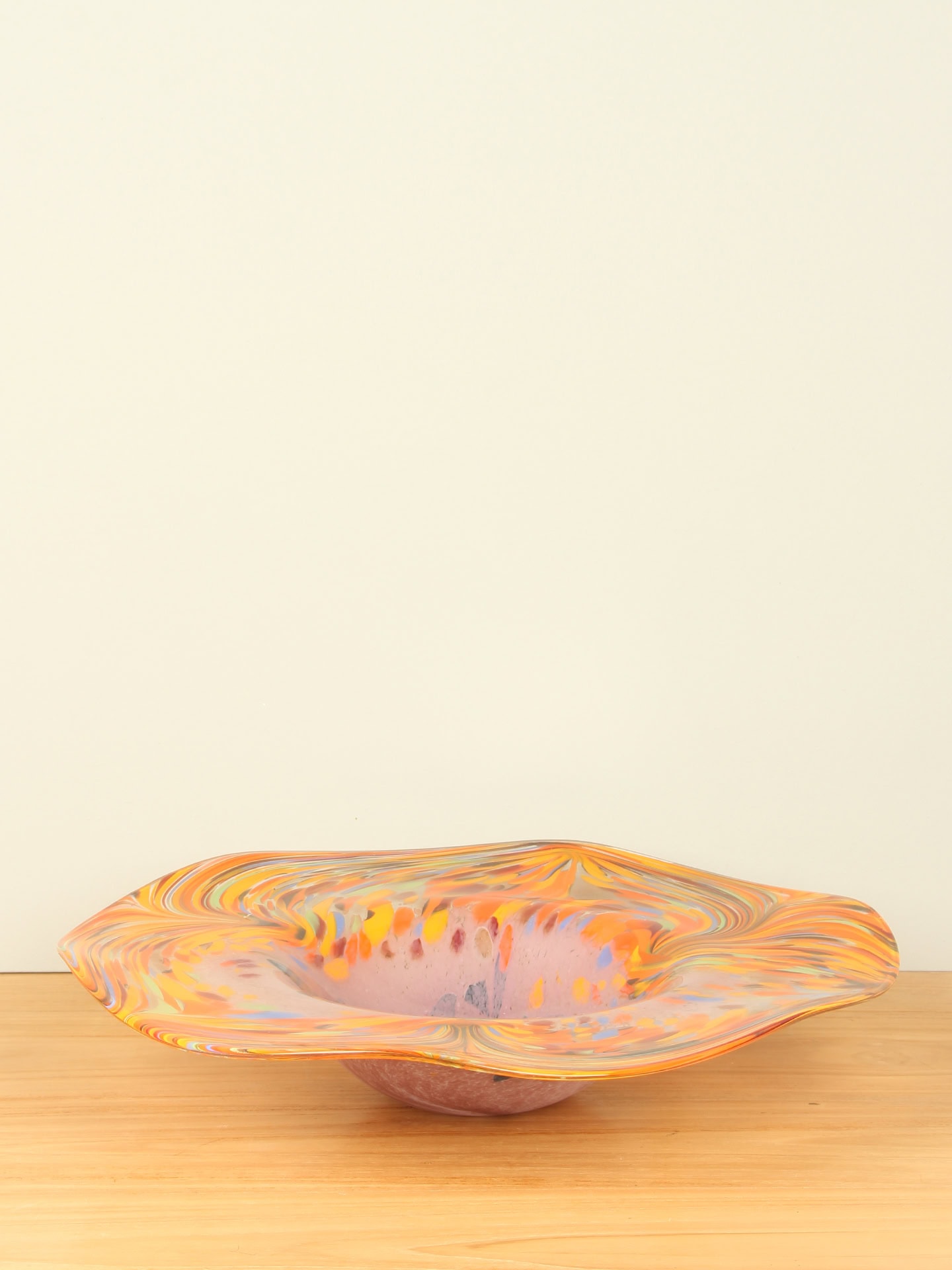 Deze glazen schaal is het resultaat van puur ambacht: een samenspel van hitte, beweging en kleur dat alleen tijdens het glasblazen kan ontstaan. Terwijl het vloeibare glas wordt gedraaid en gevormd, ontstaan patronen die zich niet laten voorspellen. Soms krachtig en expressief, soms juist vloeiend en zacht — maar altijd uniek. Geen twee schalen zijn ooit identiek, en dat is precies wat dit object zo bijzonder maakt.