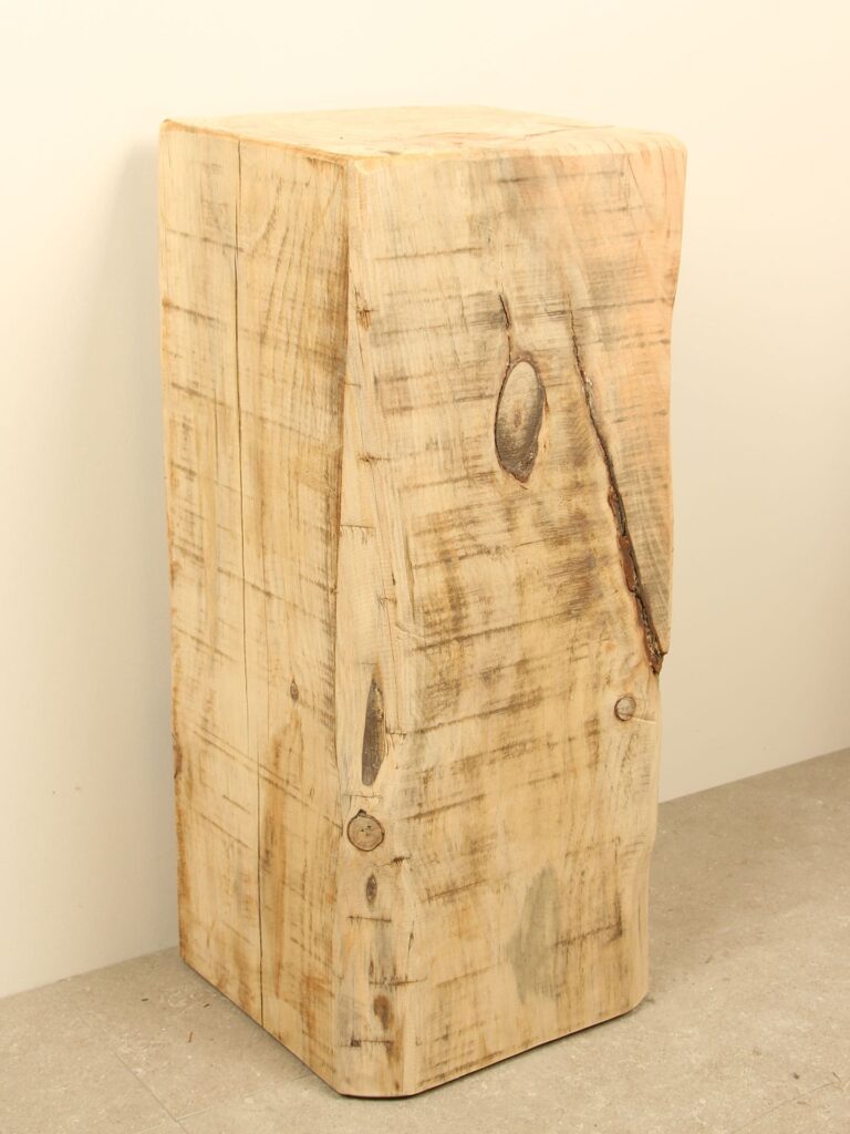 Deze grenenhouten sokkel is uitsluitend geschikt voor gebruik binnenshuis. Door de natuurlijke eigenschappen van hout kan het materiaal reageren op temperatuur en luchtvochtigheid, wat juist bijdraagt aan de levendige en natuurlijke uitstraling.