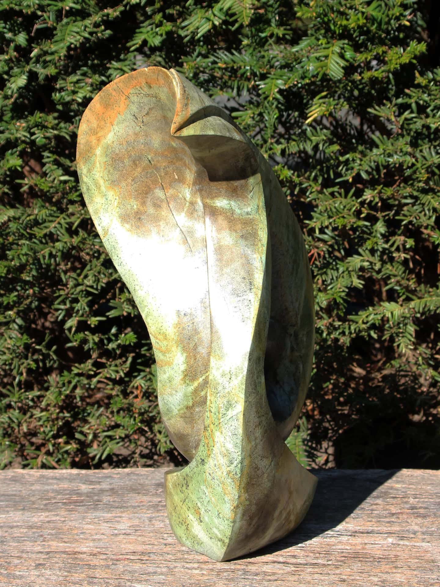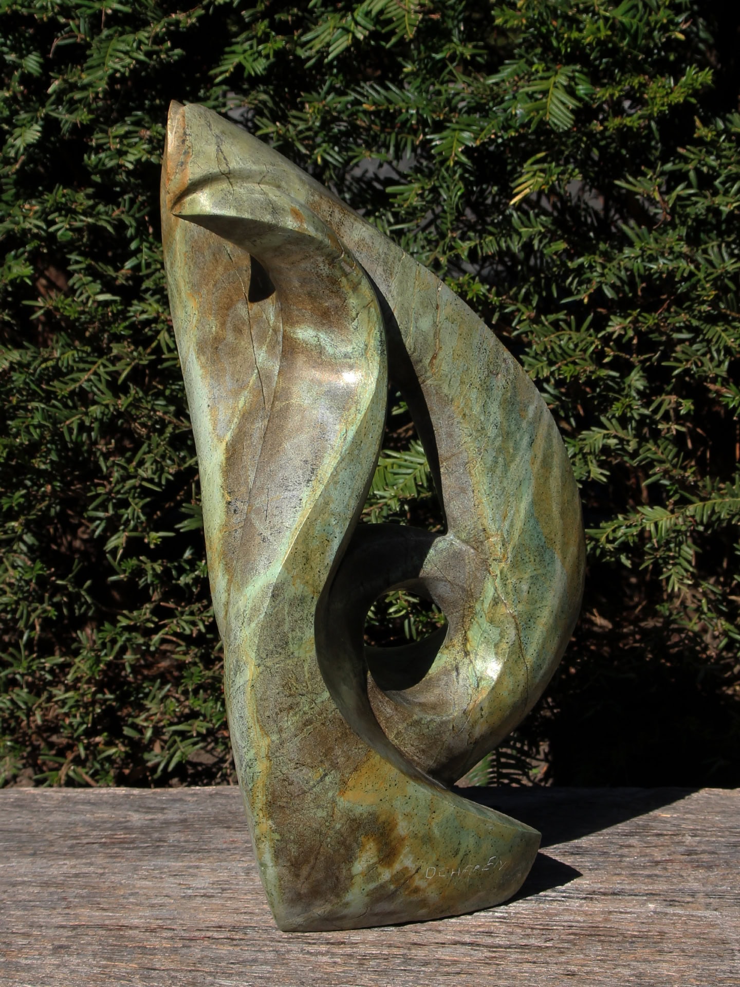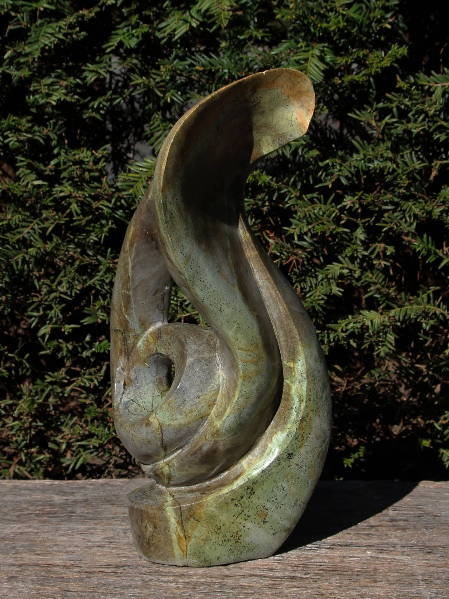 Serpentijn is dé klassieke steensoort van de Zimbabwaanse beeldhouwkunst. De steen varieert van zachtgroen tot diepzwart en laat zich prachtig polijsten. Een beeld uit Serpentijn weerspiegelt de verbinding tussen mens en natuur. De glanzende, organische vormen brengen harmonie en diepte in elke ruimte.