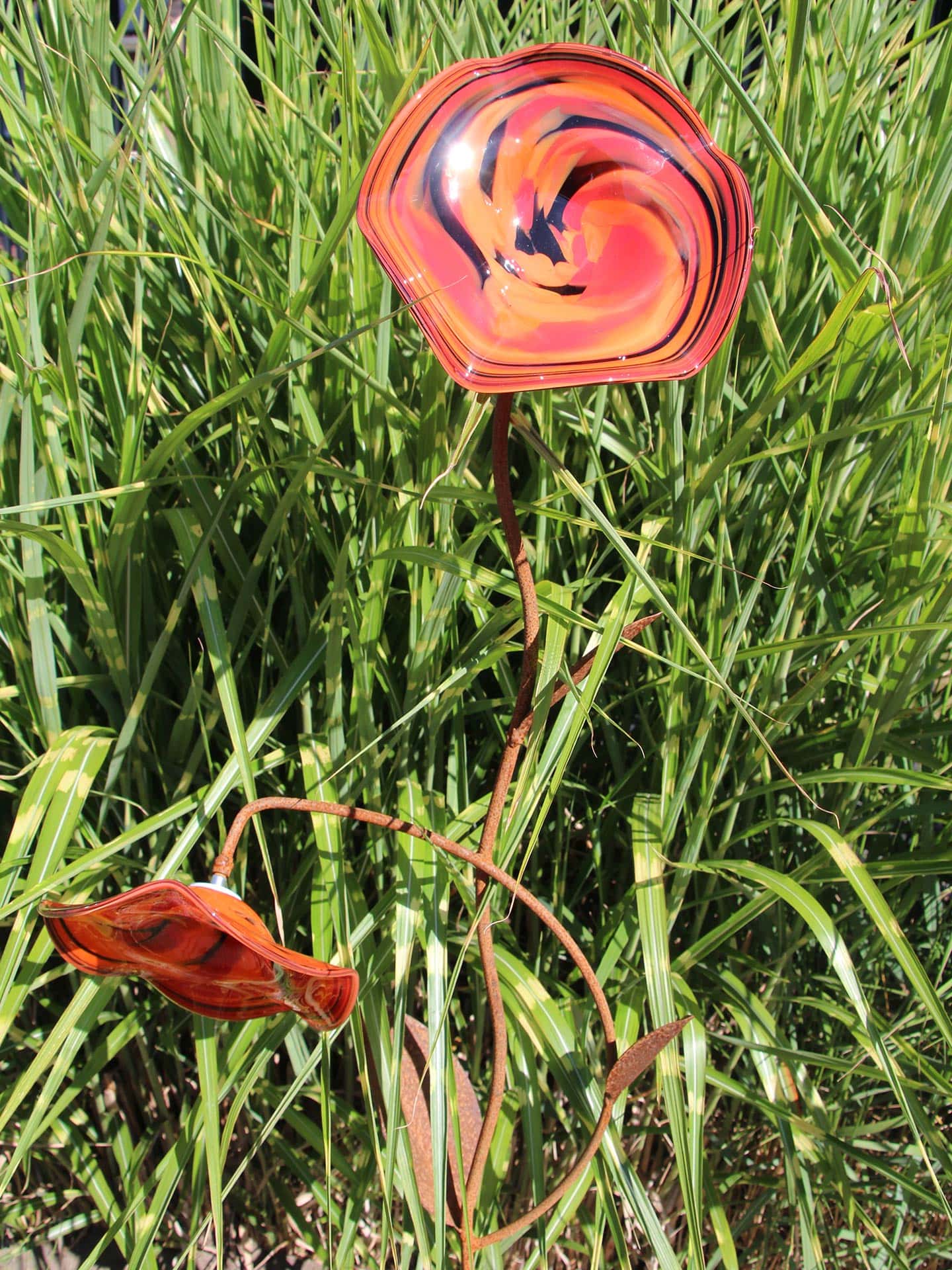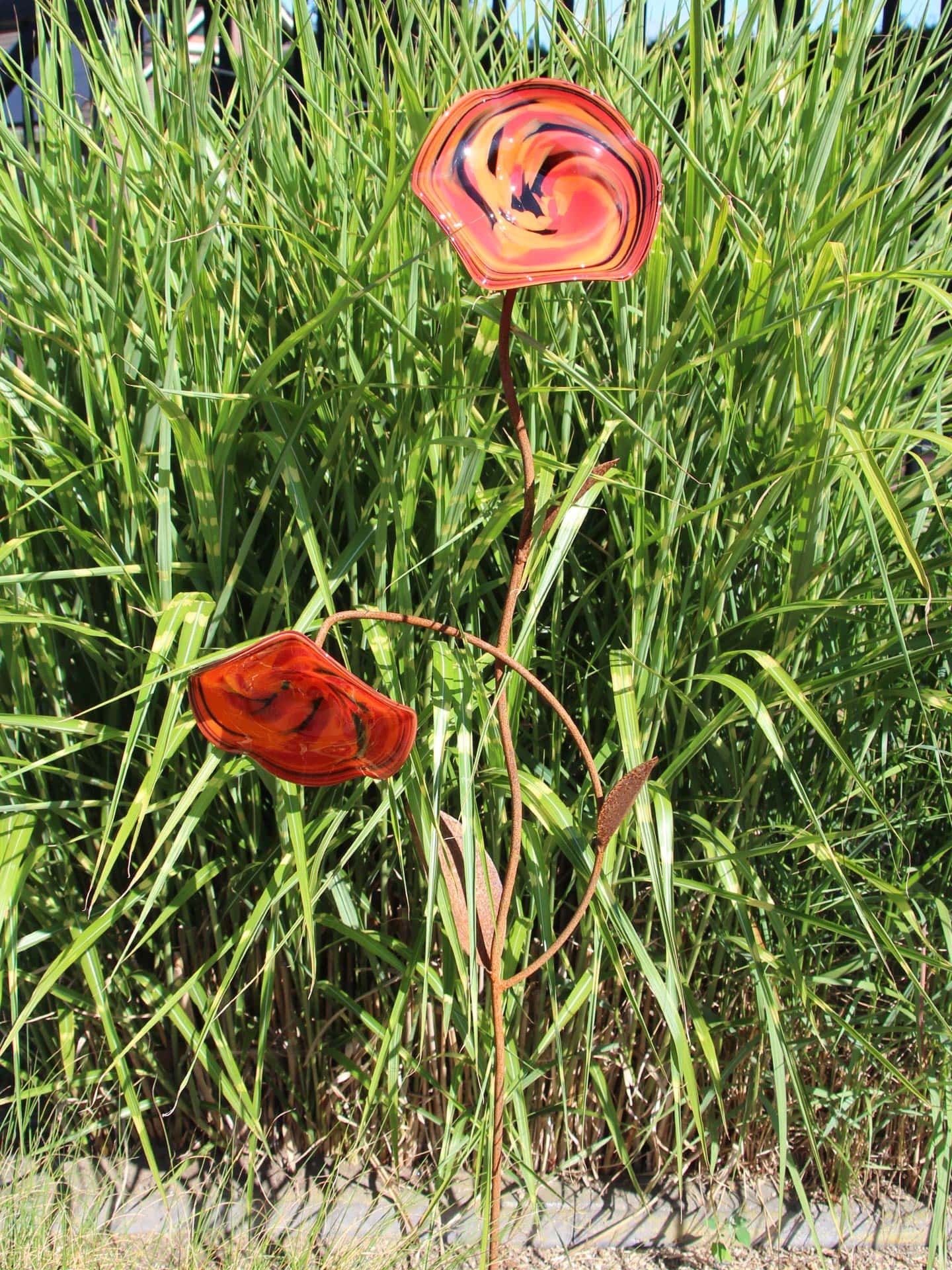 Tuinprikker – Rood – Glas – 2 Lavakleurige Bloemen op roestkleurige steel