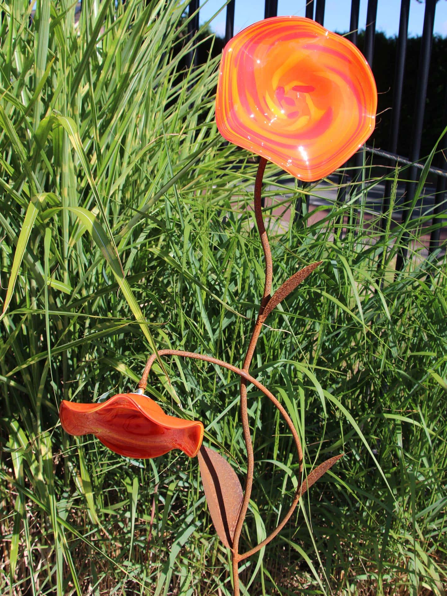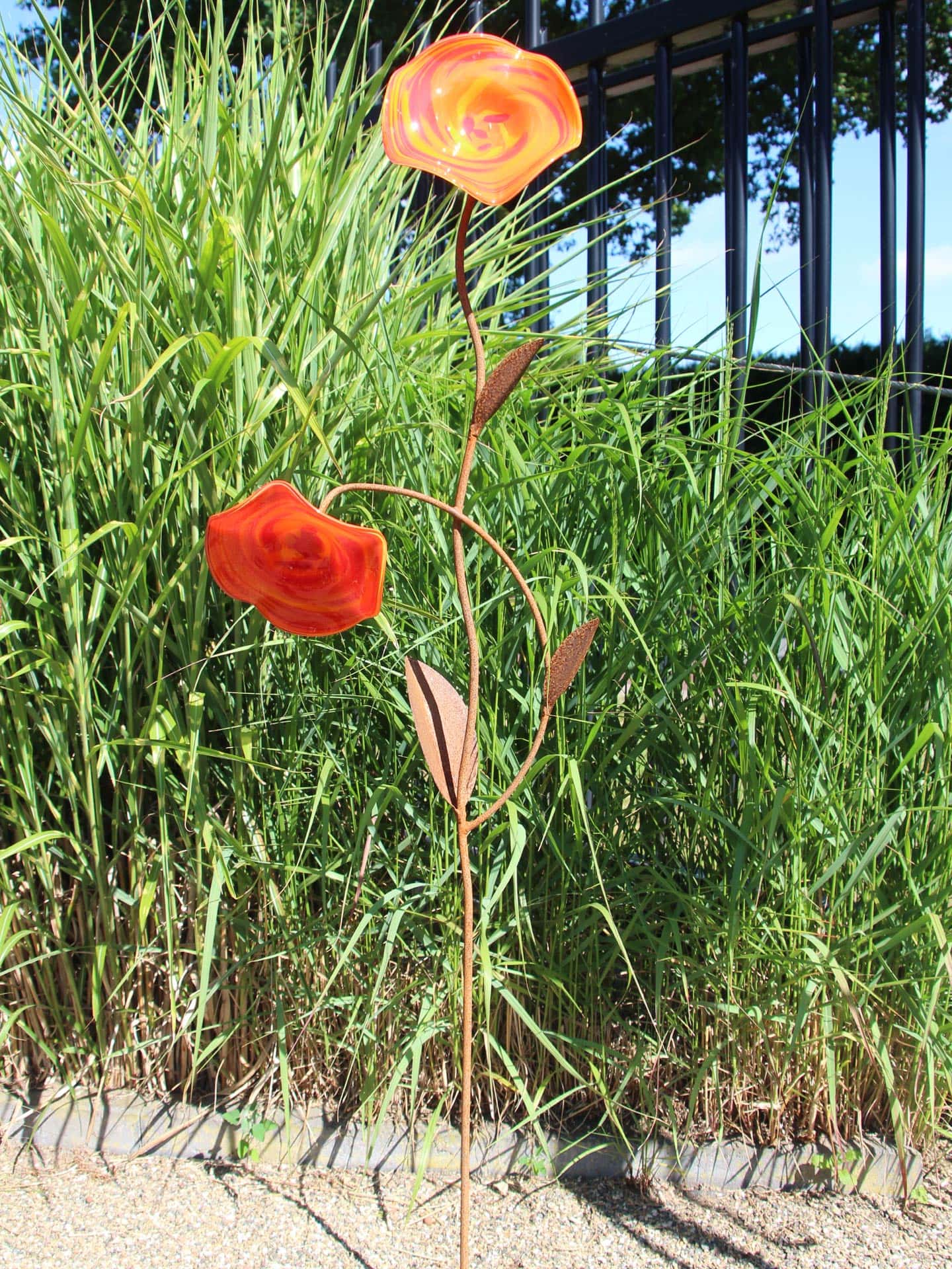 Tuinprikker – Rood – Glas – 2 Rode Bloemen op roestkleurige steel