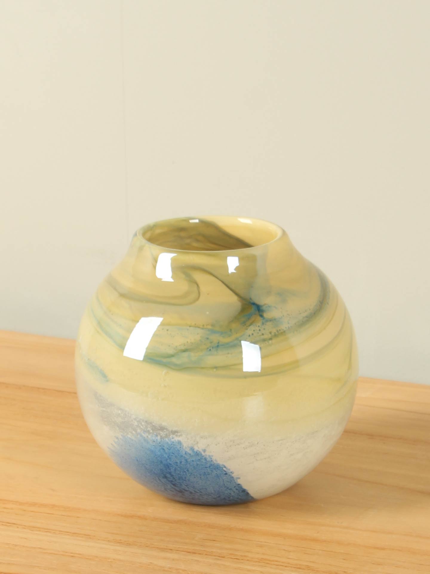 Deze vaas is een stukje glaskunst dat is ontstaan in het moment. Terwijl het hete glas wordt gedraaid en gevormd, mengen kleuren zich op een manier die niet te sturen is, maar vanzelf ontstaat. Zo ontwikkelt elke vaas een eigen uitstraling — soms speels en kleurrijk, soms juist rustiger — maar altijd met een uniek karakter dat niet te dupliceren is.