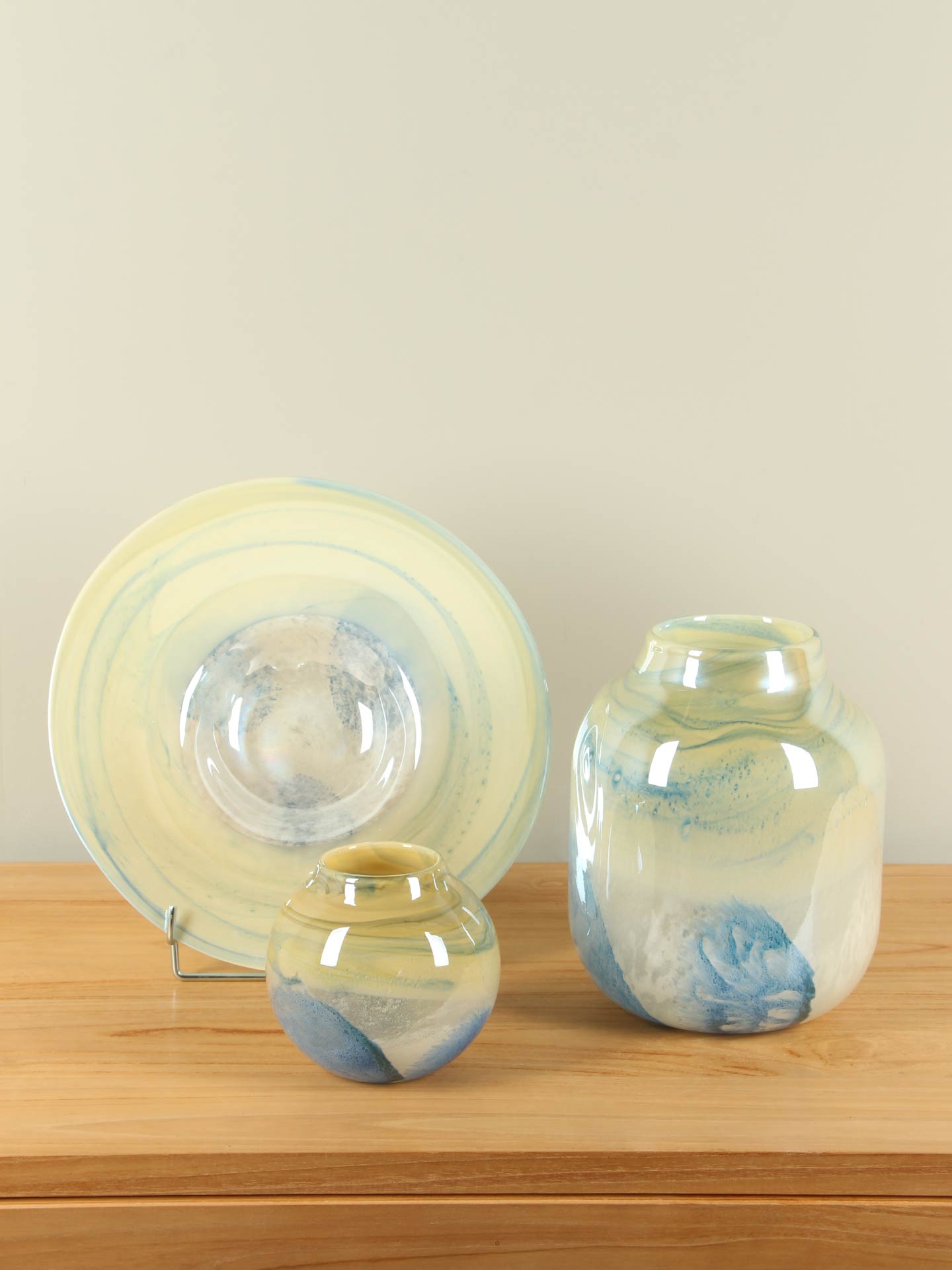 Deze vaas staat prachtig op een dressoir, bijzettafel of vensterbank, waar het glas het licht mooi vangt. Wilt u haar nóg meer laten spreken, dan is een passende sokkel een stijlvolle toevoeging die het lijnenspel en de kleuren extra benadrukt.