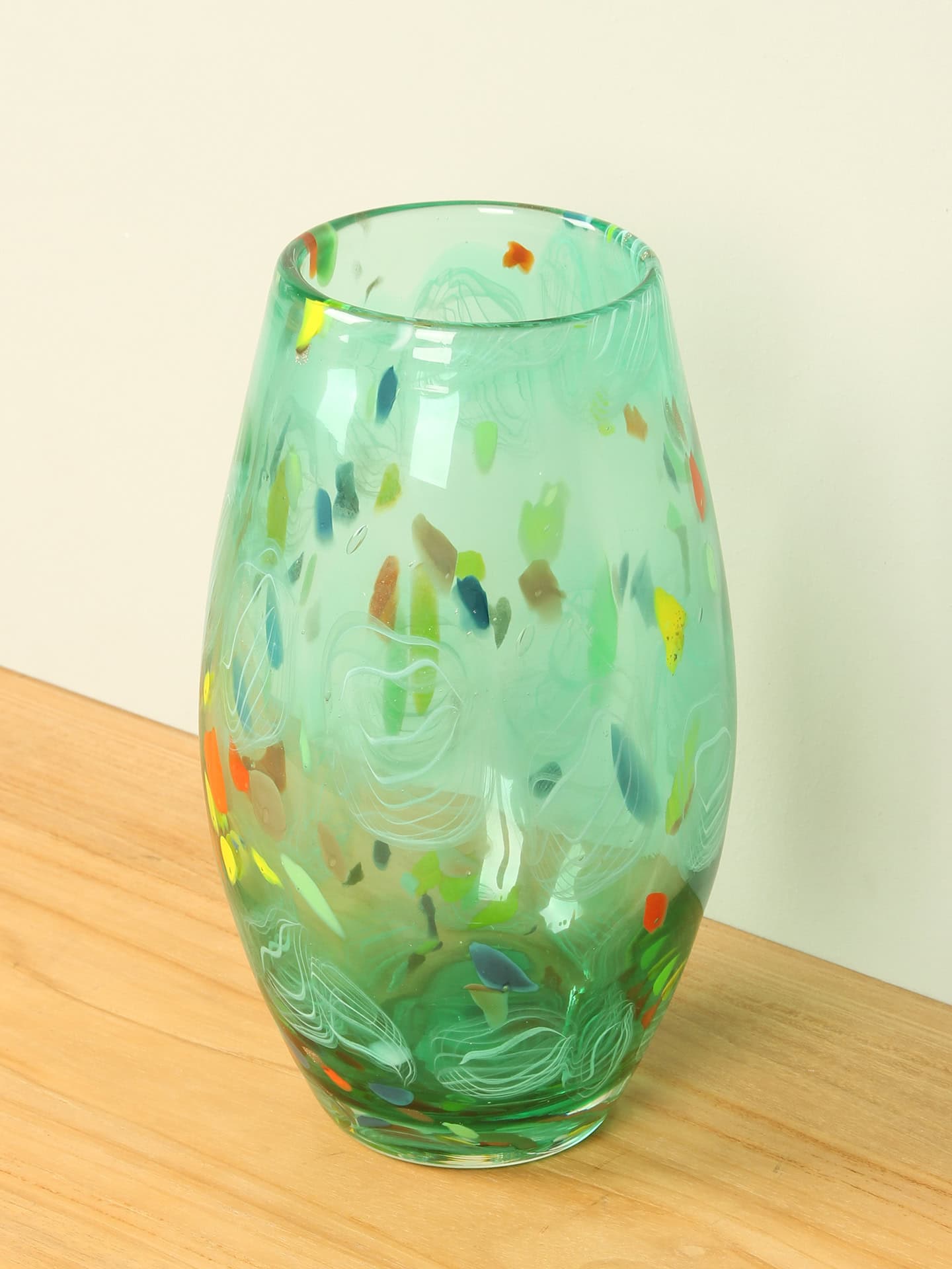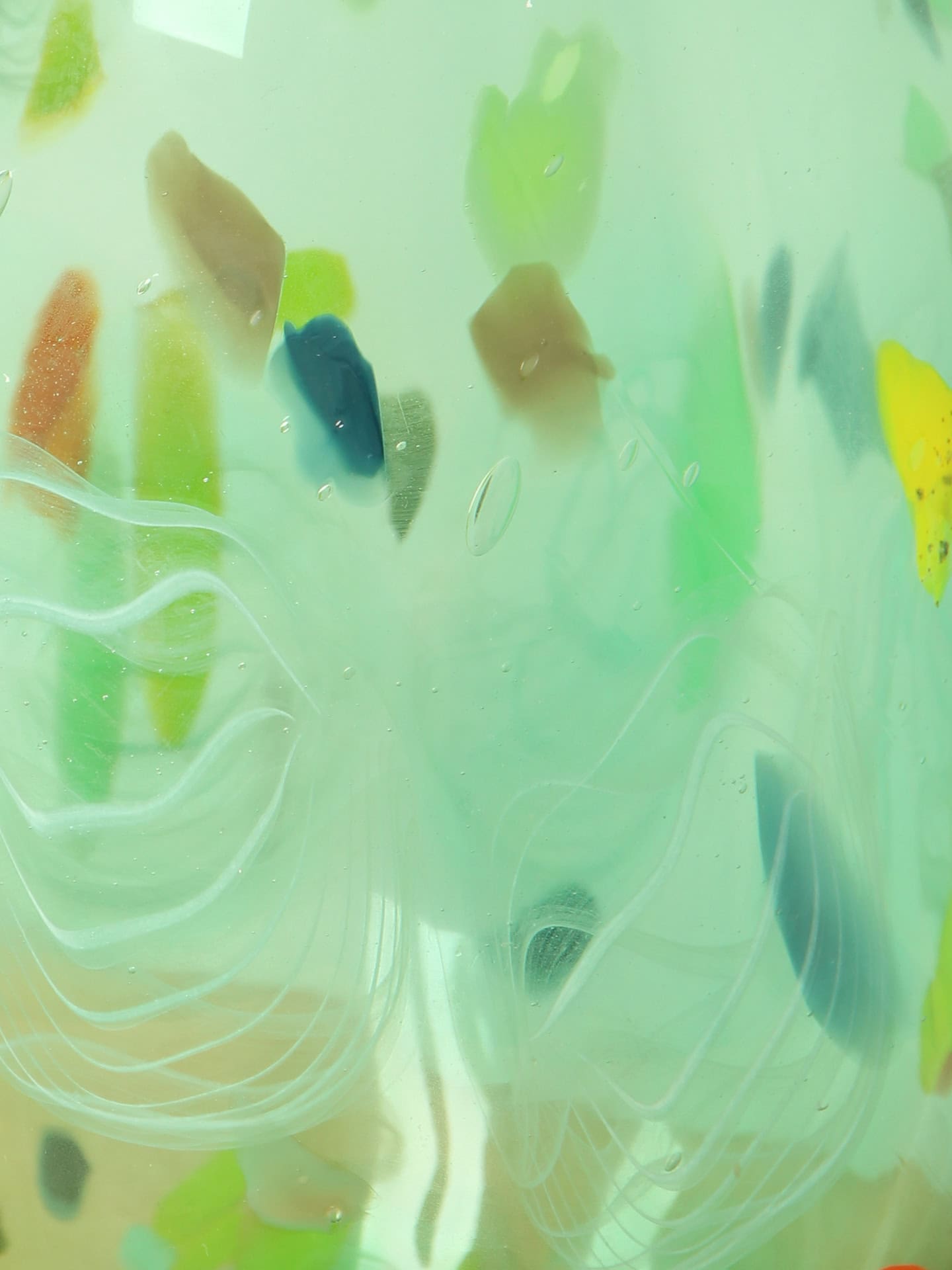Deze vaas is een stukje glaskunst dat is ontstaan in het moment. Terwijl het hete glas wordt gedraaid en gevormd, mengen kleuren zich op een manier die niet te sturen is, maar vanzelf ontstaat. Zo ontwikkelt elke vaas een eigen uitstraling — soms speels en kleurrijk, soms juist rustiger — maar altijd met een uniek karakter dat niet te dupliceren is.