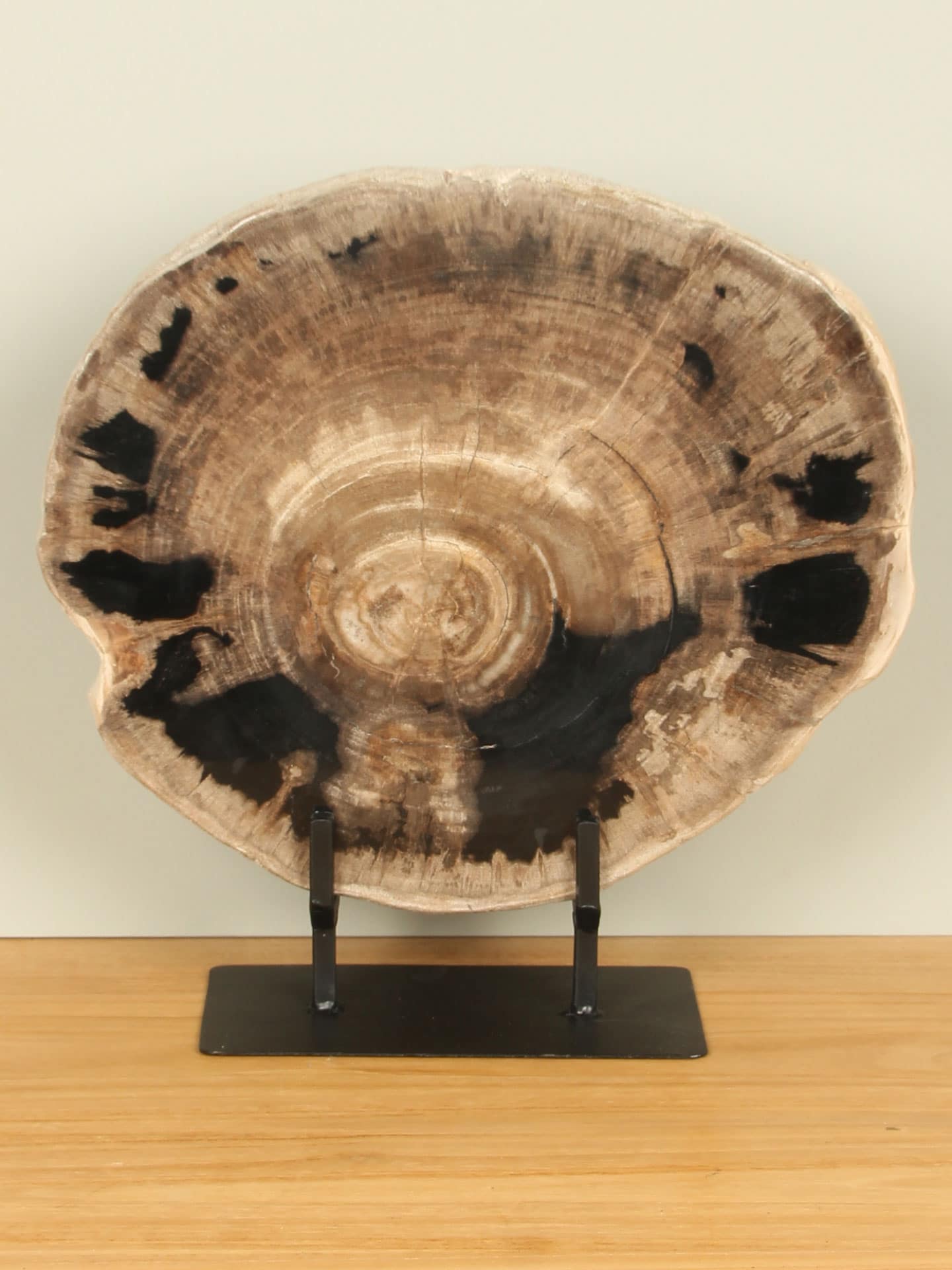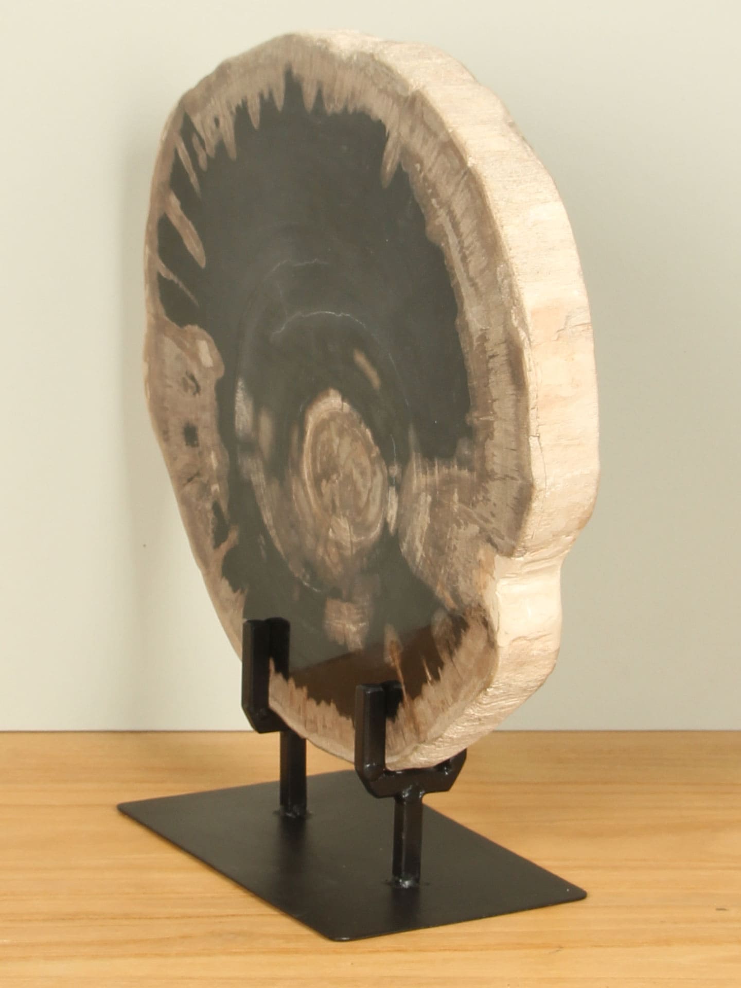 Deze unieke schijf versteend hout op standaard is een puur natuurkunstwerk, gevormd door miljoenen jaren van druk, hitte en mineralisatie. Het resultaat is een bijzonder organisch patroon dat doet denken aan de jaarringen van een oude, tijdloze wereld. De deels gepolijste afwerking versterkt de natuurlijke glans zonder het rauwe karakter te verliezen. Prachtig als interieuraccent of als decoratief statement in uw woning. Een exclusief stuk, want geen schijf is hetzelfde.