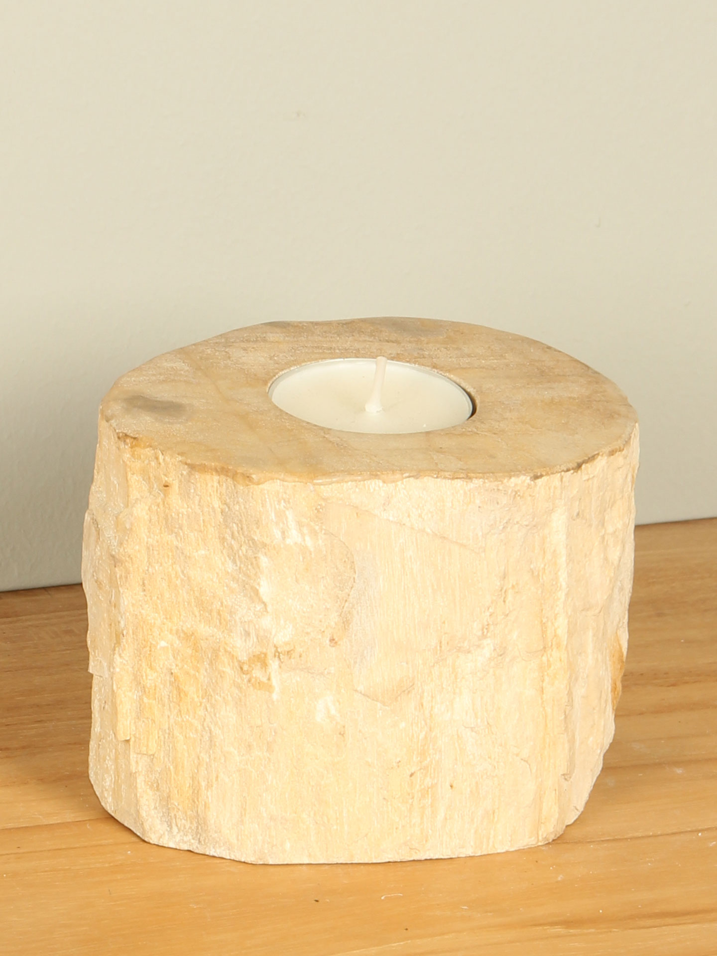 Deze waxinelichthouder is gemaakt van versteend hout, ook wel fossiel hout genoemd: hout dat door de natuur zelf in miljoenen jaren is omgevormd tot steen. Dit stuk was ooit een levende boom, die bedekt raakte onder sediment en vulkanische as. Door langdurige druk en hitte werden de houtcellen langzaam vervangen door mineralen zoals kwarts. Het resultaat is steen met de structuur van hout — robuust, tijdloos en vol verhaal.