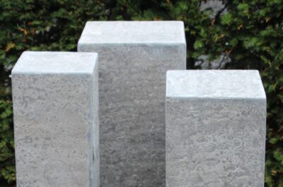 Met een hoogte van 80 cm vormen deze sokkels en zuilen een mooi midden tussen subtiel en opvallend. Ze tillen een beeld voldoende op om het los te maken van de omgeving, terwijl het geheel rustig en in balans blijft. Deze hoogte is zeer geschikt voor tuinen, terrassen en binnenruimtes waar je een object wilt laten spreken zonder dat het te dominant aanwezig is.